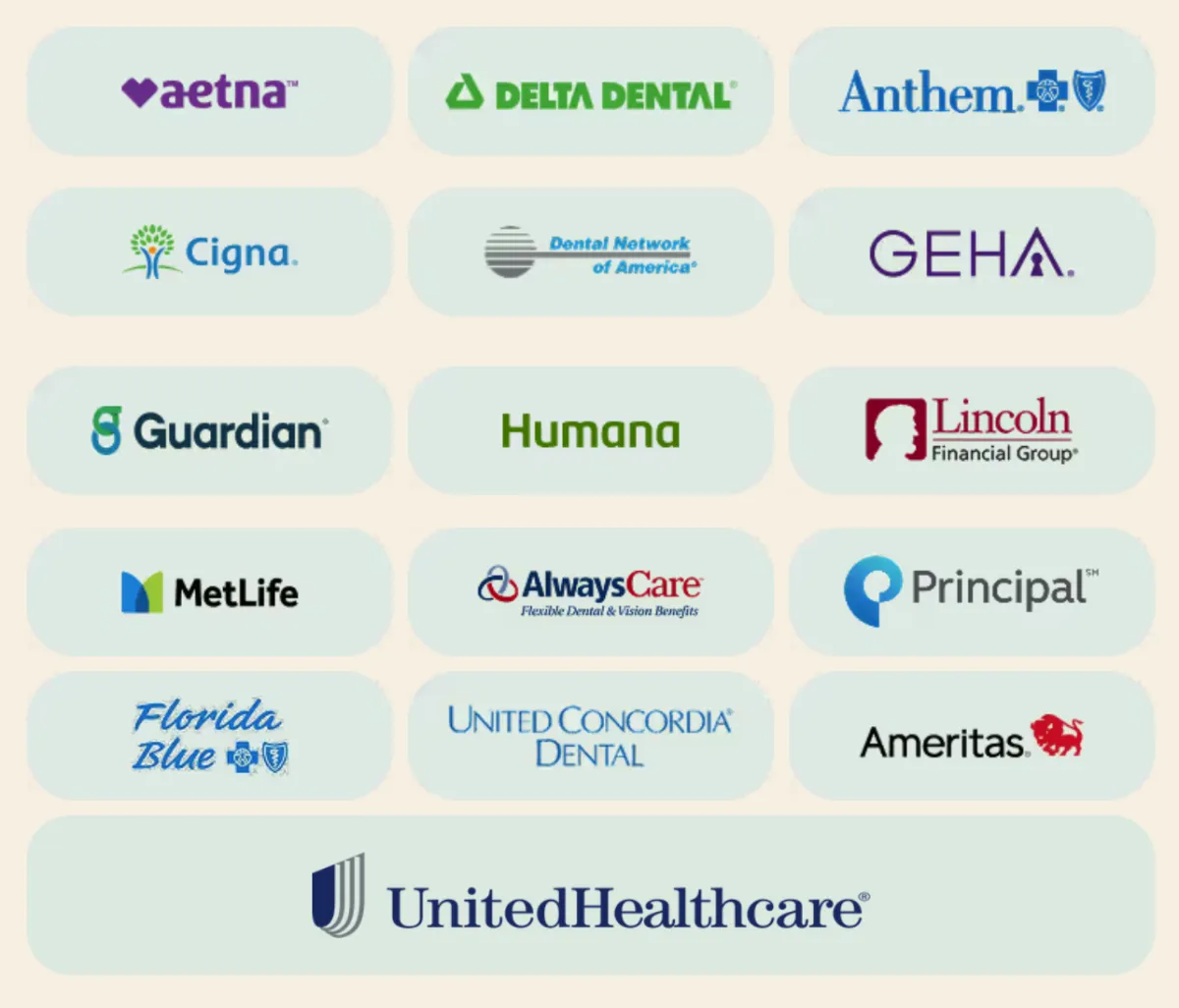 We are proud to be an in-network provider for Aetna, Delta Dental, Anthem, Cign, DNA, GEHA, Guardian, Humana, Lincoln Financial Group, MetLife, AlwaysCare, Principal, Florida Blue, United Concordia Dental, Ameritas, and United Health Care.